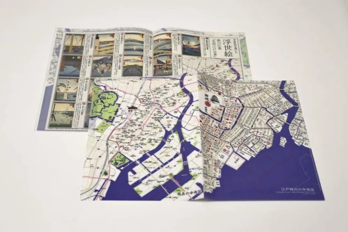 見開き時にはA3サイズになり、江戸時代と現在の中央区の地図を並べてご覧いただけます。