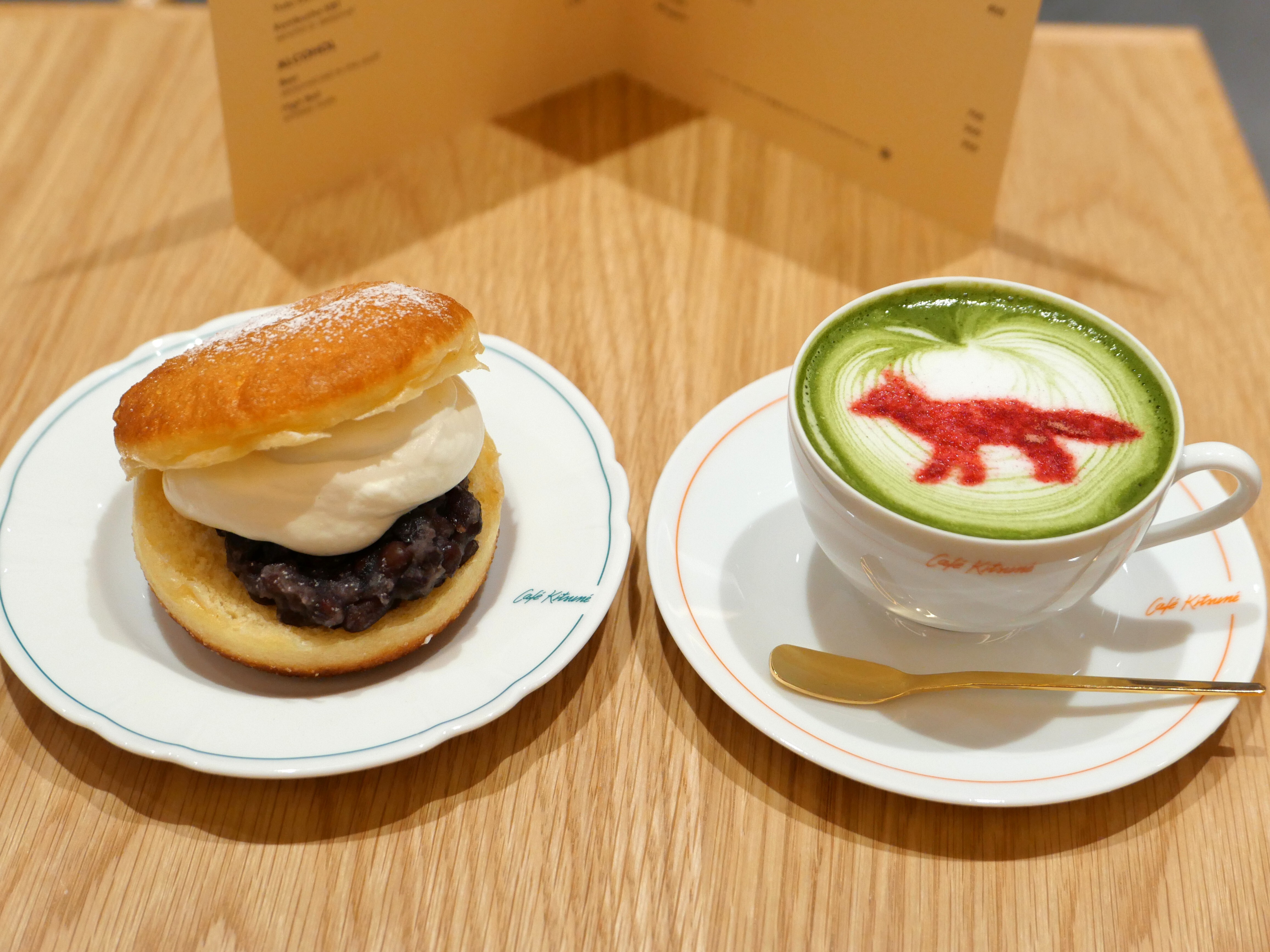 오사카점 한정인, 국산 밀가루를 사용해 쫀득쫀득한 식감의 도넛 「Kitsuné Doughnut」과 진한 딸기 시럽, 벚꽃 풍미, 말차가 믹스된 「Sakura Matcha Latte」(950엔)입니다.