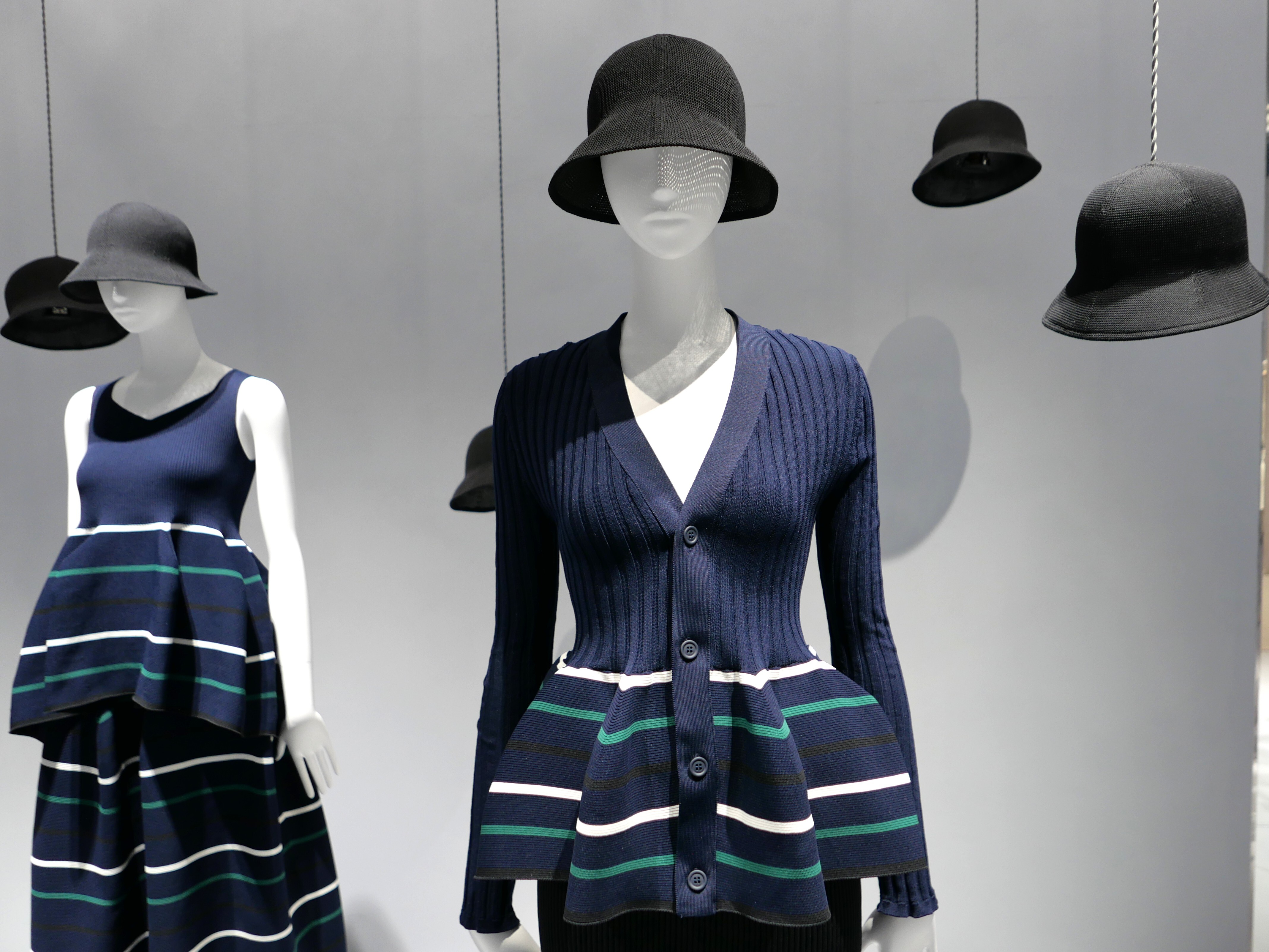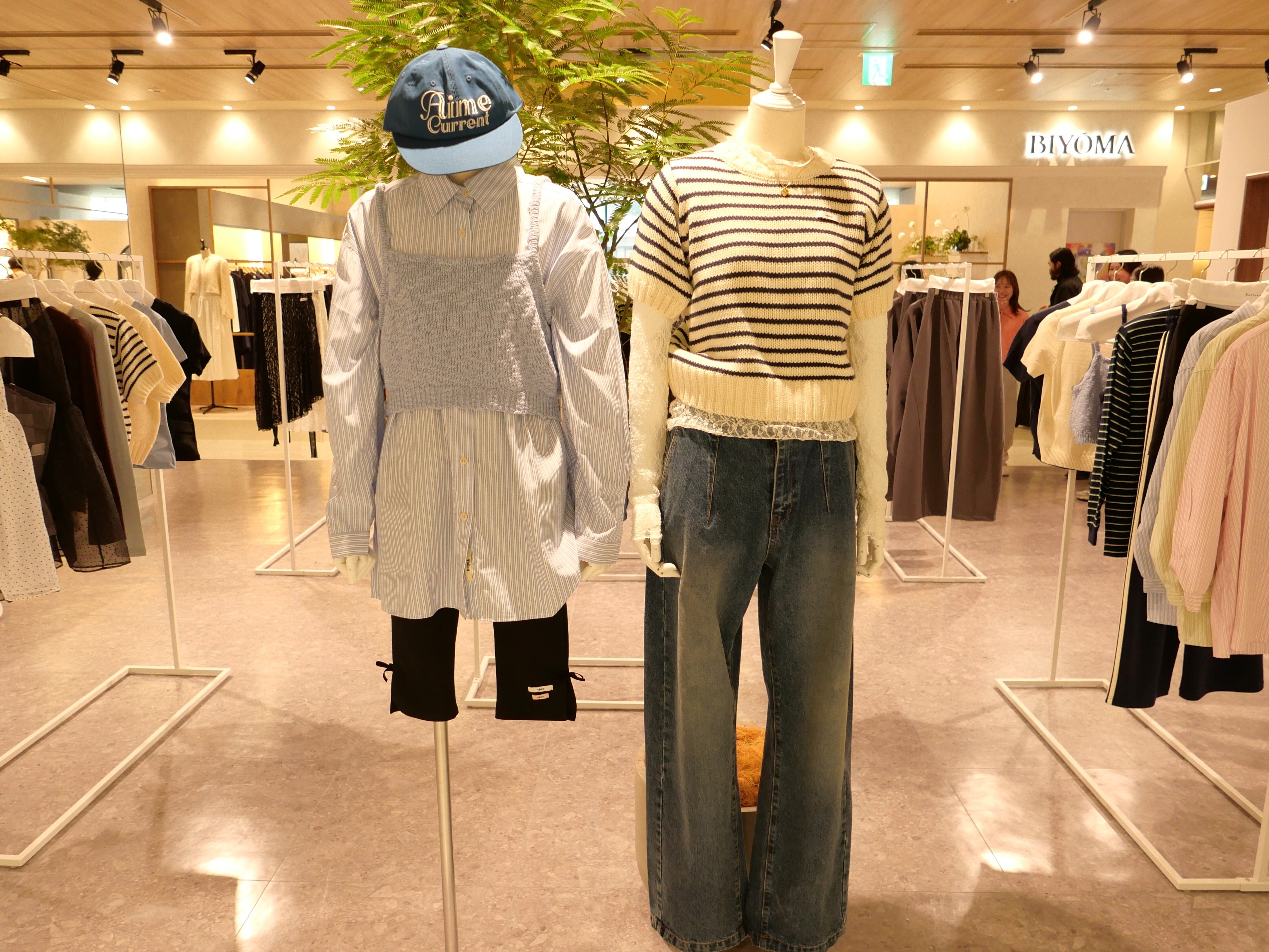 한국은 레이어드 스타일에 강해, 다양한 브랜드&아이템을 믹스해 옷을 소화합니다. 이번 시즌다운 세련된 느낌을 연출하기 위해서는 채도가 낮은 컬러의 아이템이나 숏팬츠(사진 왼쪽의 마네킹) 등을 코디네이트에 더하는 것을 추천합니다.