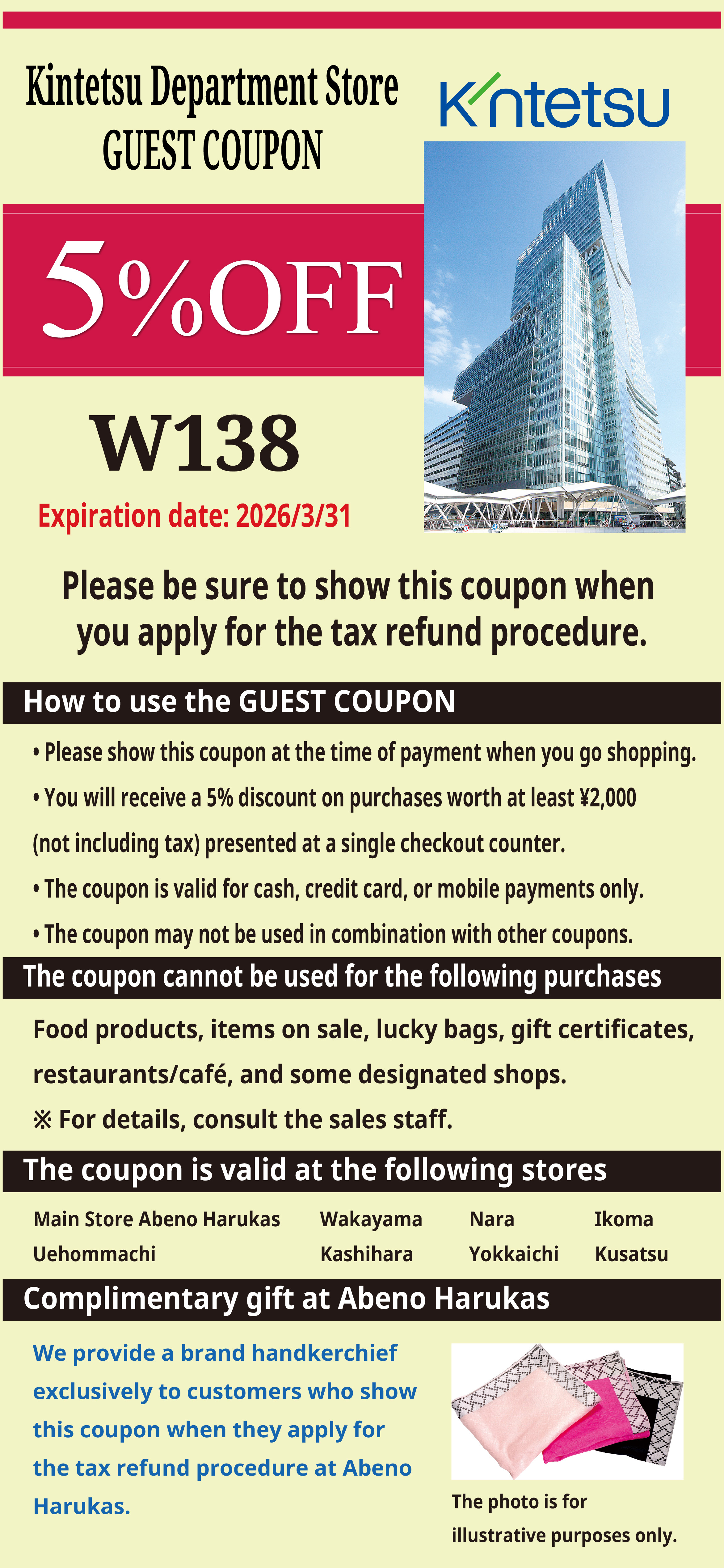 - Customers who present this coupon when going through duty-free procedures at the Abeno Harukas Kintetsu Main Store will receive a free handkerchief.