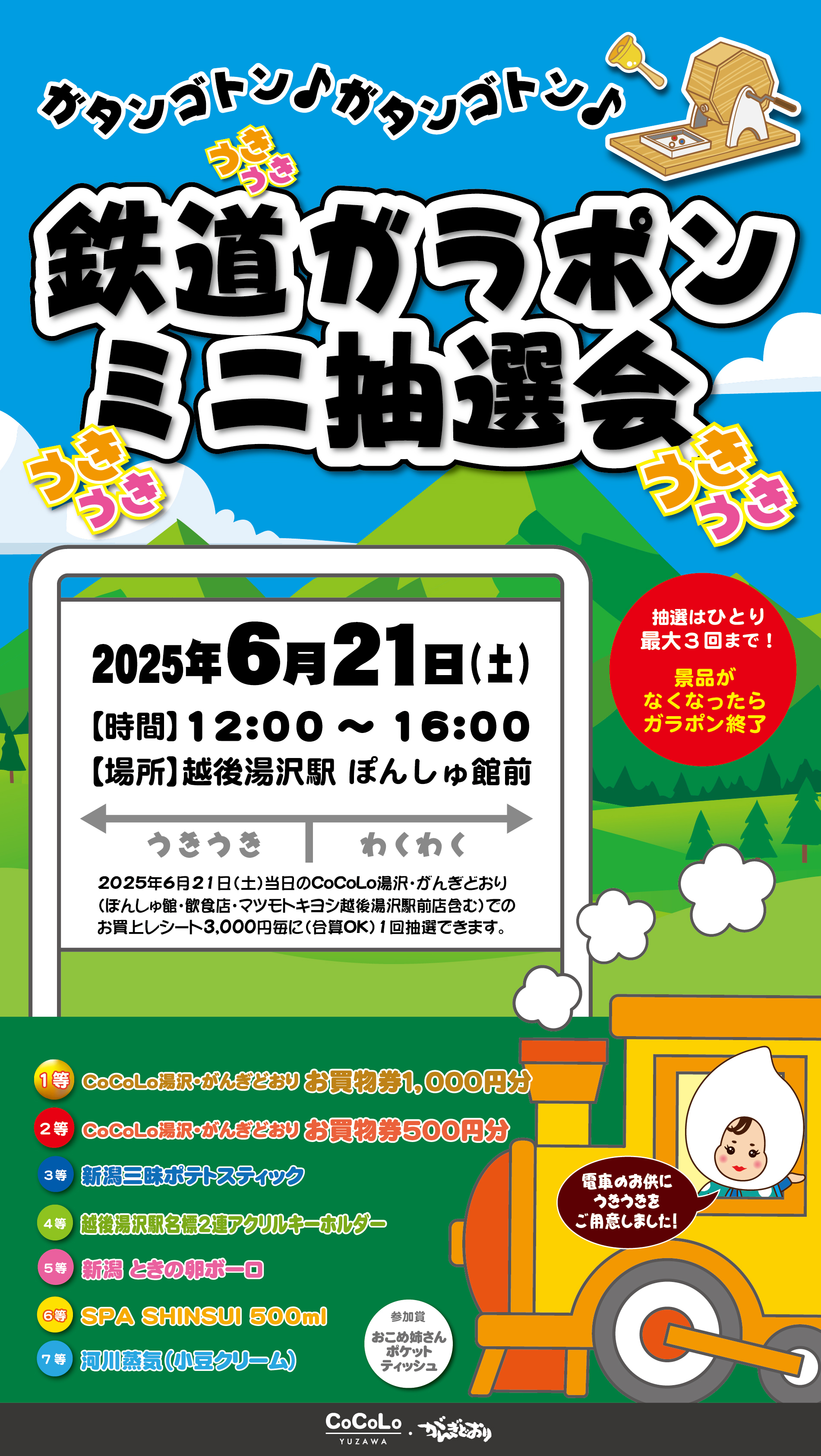 On the day (June 21, 2025, Saturday), you can draw once for every 3,000 yen (combined totals are OK) spent at CoCoLo Yuzawa/Gangi-doori (including Ponshu-kan building, restaurants, and Matsumoto Kiyoshi Echigo Yuzawa Ekimae Store).